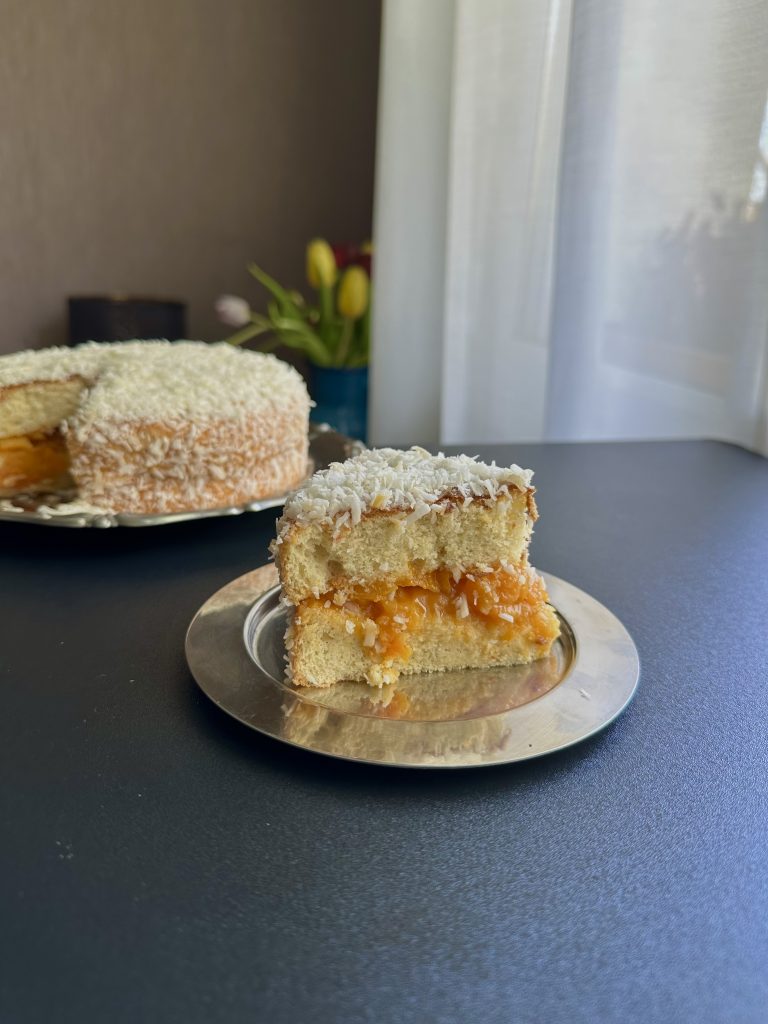 Je me suis inspirée du gâteau Richbond pour créer une version sous forme de cake, plus accueillante et propice au partage. Cette adaptation est plus simple et rapide à réaliser. Il s’agit d’une génoise à la vanille agrémentée d’une compotée d’abricot à la fleur d’oranger, le tout enveloppé de noix de coco.