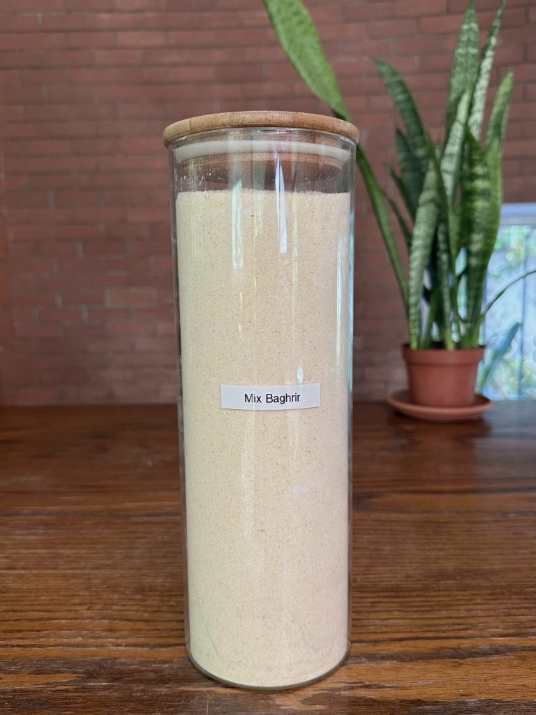 Quand je sais que je vais préparer des Baghrir sans gluten régulièrement, comme pendant le Ramadan par exemple, je me facilite la vie en mélangeant juste ce qu’il faut de farine de maïs et de riz et je stocke ce mélange dans un contenant. Cela m’évite de devoir sortir les farines de riz et de maïs à chaque fois.